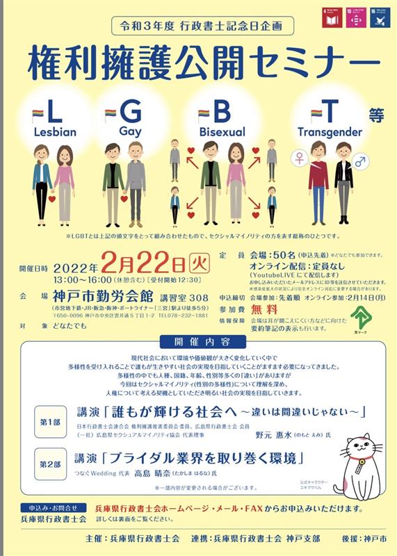 兵庫会の令和3年度行政書士記念日企画権利擁護公開セミナーにおいて、LGBT等について講演しました。
